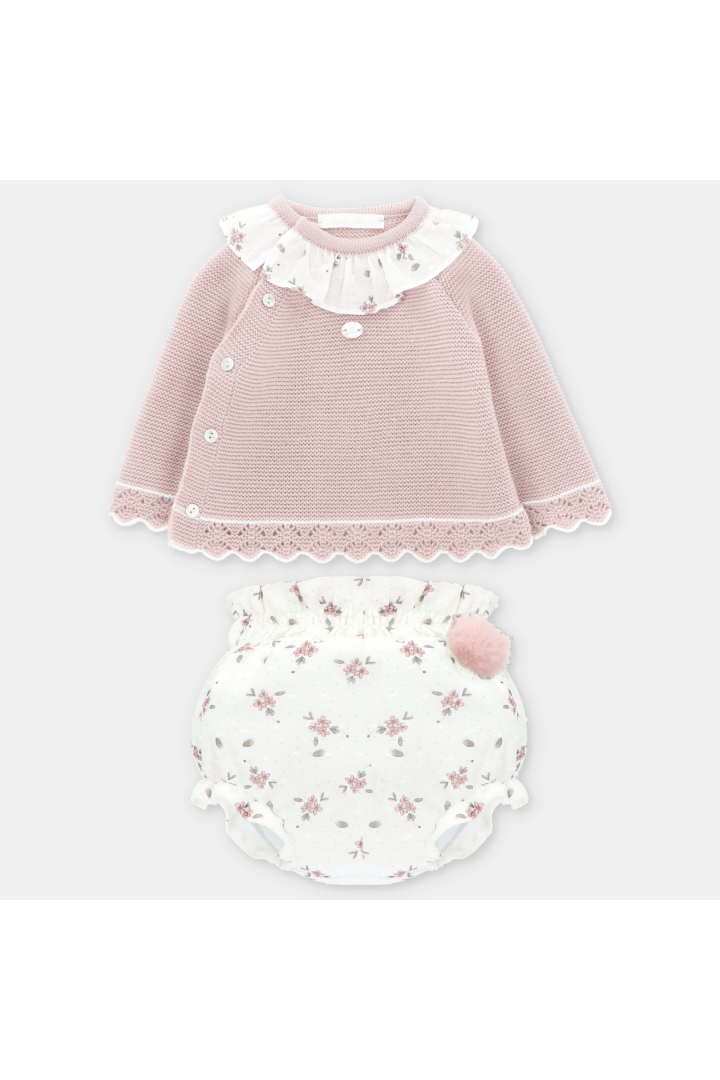 Conjunto de Martin Aranda de niña compuesto por jersey de punto rosa con cuello estampado a juego con el cubre-pañal